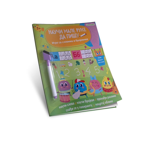 Knjiga sa flomasterom koji se briše. Deca će lako pisati, brisati i ponovo pisati uz magični brisač na flomasteru. Knjiga sa zadacima- prva slova, brojevi…